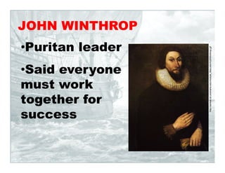 1) John Winthrop was a Puritan leader who said the early settlers must work together for success. 2) The Pilgrims were a group of dissenters and separatists who fled religious persecution in England and later Holland, traveling to America for religious freedom on the Mayflower. 3) The Mayflower Compact established the practice of self-government and majority rule among the Pilgrims settling in Plymouth, Massachusetts.