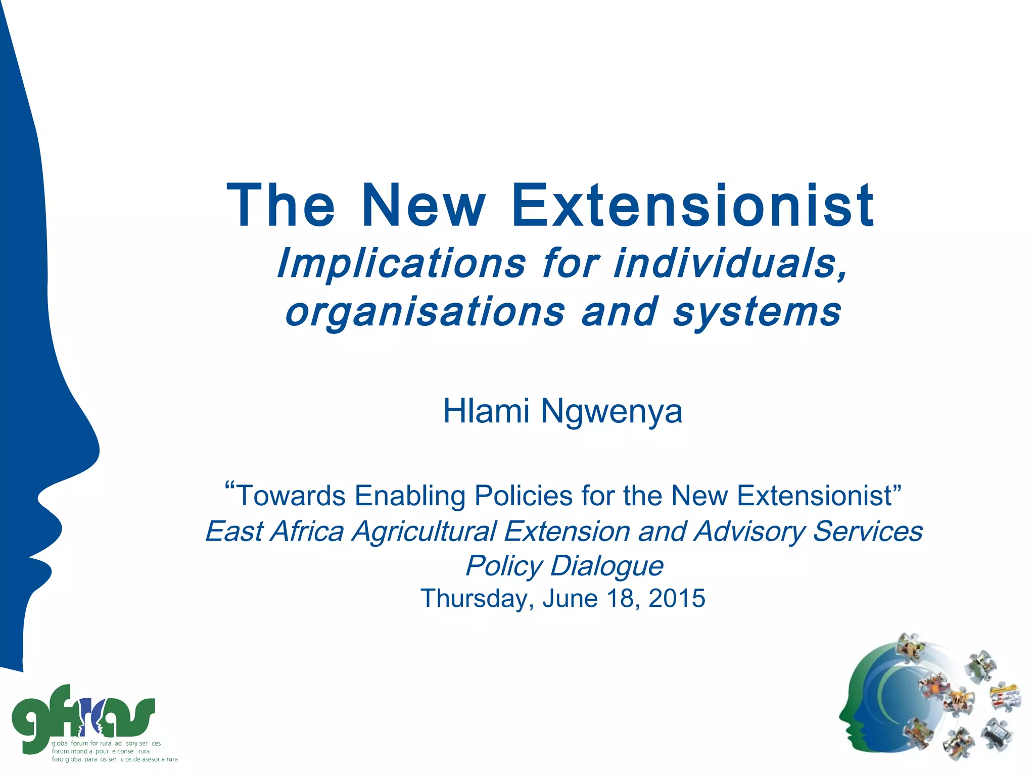 The document discusses the "New Extensionist" which takes a broader, more systemic view of agricultural extension beyond strengthening individual skills. The New Extensionist views extension as actors from various public, private, and civil society organizations who support rural communities in many ways. Agricultural innovation systems and social systems are complex with many interdependent parts, similar to the human body or a motor vehicle. Managing participation and harmonization across different service providers is important for managing systemic change within agricultural extension and advisory services.