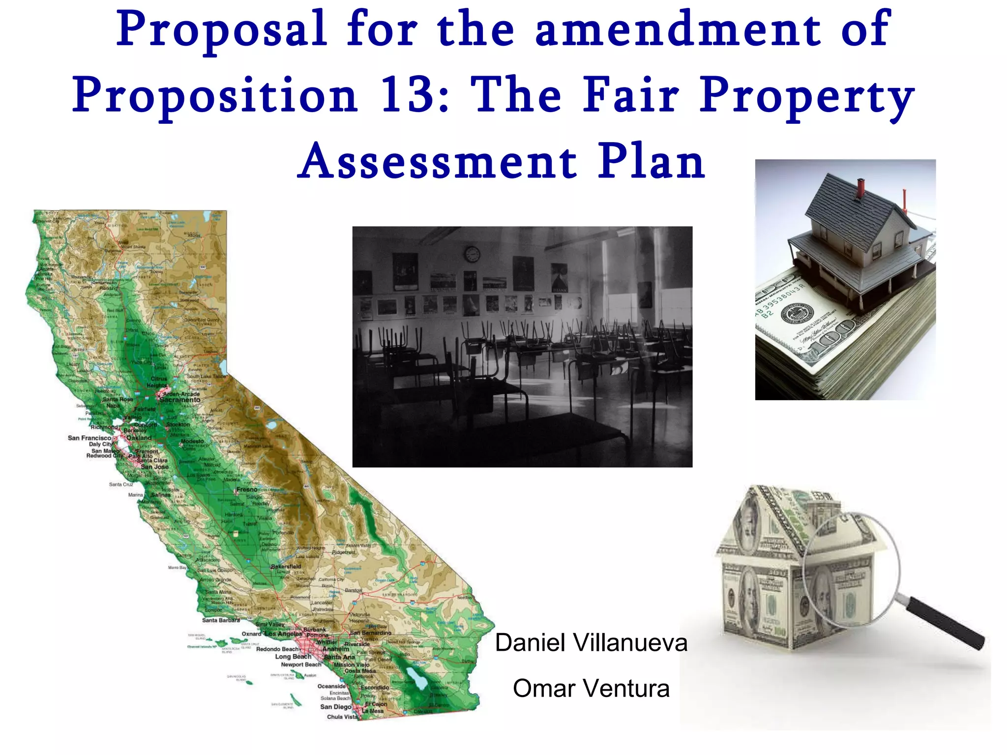 The document outlines a proposal to amend Proposition 13 in California, presenting a fair property assessment plan that distinguishes between commercial and residential property taxation to address inequities created by the original proposition. It discusses the historical context, consequences, and statistical analyses showing disparities in tax burdens post-Proposition 13. The plan aims to generate significant revenue by taxing commercial properties at full cash value while preserving residential tax structures, promoting land use efficiency, and engaging citizens in the legislative process.