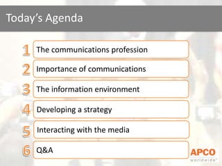 The document provides an overview of strategic communications and interacting with the media. It discusses the changing media landscape, importance of developing a communications strategy, and outlines steps for effective media interaction. These include understanding reporter styles, maintaining message control through bridging and flagging, enhancing delivery with examples and emotion, and being prepared with tested key messages while avoiding guesses or criticism of the media. The goal is to shape public and stakeholder perceptions through strategic, on-message interactions with reporters.