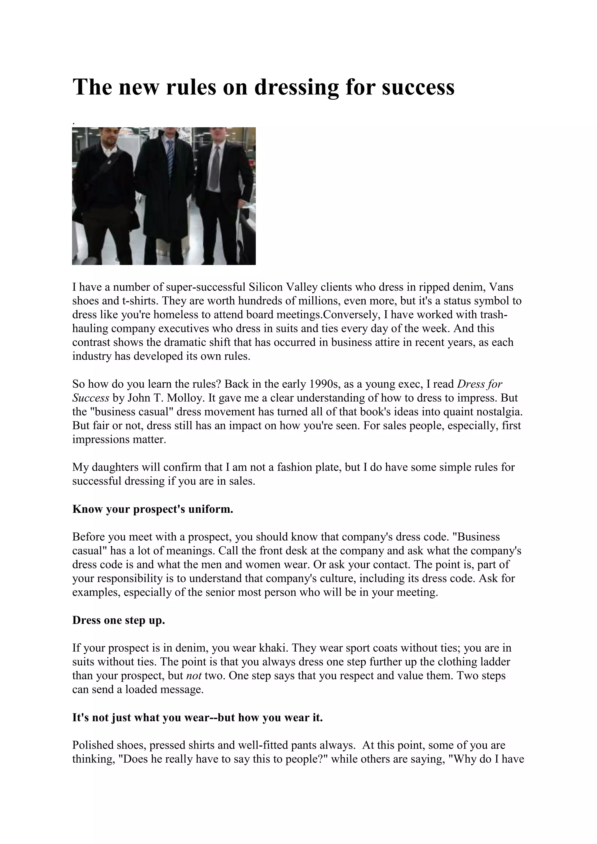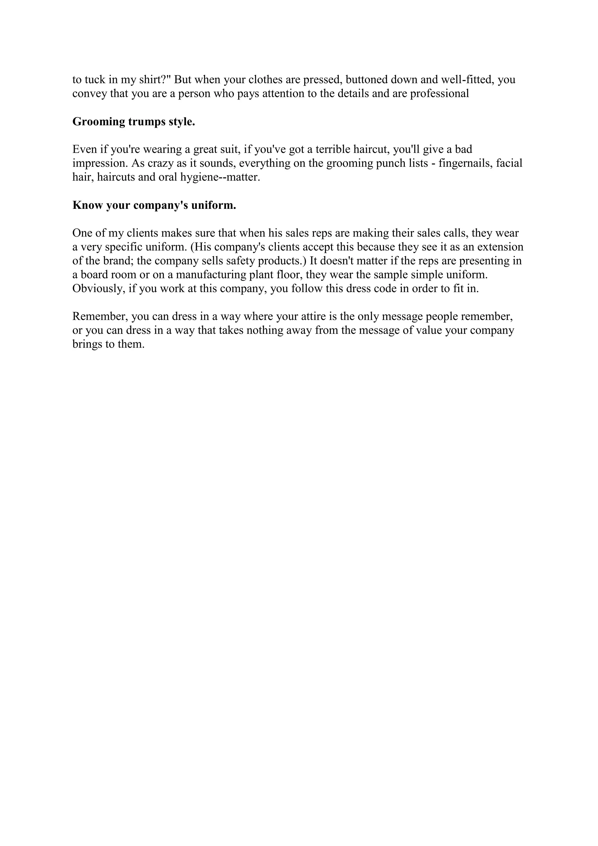The document provides tips for dressing appropriately when meeting with clients or prospects. It advises salespeople to learn the dress code of the company they are visiting by calling ahead or asking their contact. They should then dress one step nicer, such as wearing a suit without a tie if the client wears a sport coat. Additional tips include being well-groomed, having polished shoes and pressed clothes to convey professionalism, and knowing one's own company's uniform. The overall message is that dress makes an impression and salespeople should dress respectfully according to their prospect's norms while maintaining a slightly higher level of formality.