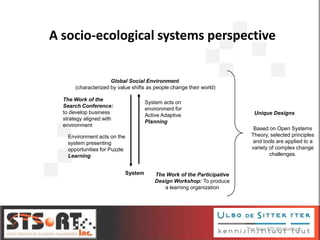 This document describes the participative design workshop (PDW) process for organizational redesign using a socio-ecological systems perspective. The PDW has three phases: analysis of the current situation, redesigning the organization's structure and workflows, and planning implementation. It utilizes design principles, rapid iteration, and prototyping. Participants work in "mirror groups" to analyze factors like employee engagement, analyze skills, and design the new organization structure. The goal is to produce an optimal redesign of the organization as a learning system that meets human and environmental needs.