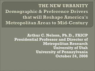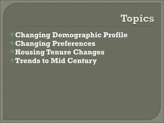 This document summarizes trends in housing, demographics, and development from 1960 to 2040. It finds that the share of households with children will decline while single-person and childless households rise. Most household growth between 2000-2040 will be among those without children. Preferences are also shifting towards more compact urban or attached housing options. Renting is projected to increase, with more renters located in central cities. Total nonresidential and residential construction through 2040 is estimated to reach $16 trillion, accounting for half of all US construction.