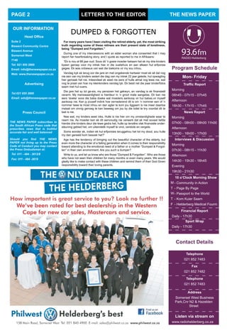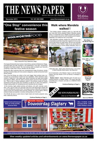 The document highlights the passing of Nelson Mandela and suggests visiting various landmarks in the Western Cape to honor his legacy, including Robben Island and Cape Town City Hall. It also features the grand opening of Woolworths' new food market, offering an extensive range of fresh produce and prepared meals for the festive season. Additionally, it addresses social issues, recounting a poignant story from an elderly woman's perspective on familial neglect.