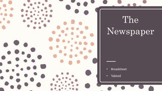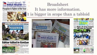 There are two main types of newspapers: broadsheets and tabloids. Broadsheets contain more information and are larger in scope, while tabloids are smaller and more condensed, focusing on stories about people and celebrities. Newspapers are divided into different sections, including the front page for the main story, editorial pages containing opinions, and sections for sports, business, classified ads, entertainment, life and leisure, and obituaries.