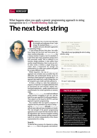 This document discusses applying a generic programming approach to string management in C++. It finds that STL-based sequences like std::vector and std::basic_string, combined with STL algorithms, provide a simple and effective way to represent and manipulate strings. Common string operations like searching, modifying, and converting between types can be implemented independently of the underlying string representation using function templates and iterators. This approach is more flexible than solutions tied to a single string type.