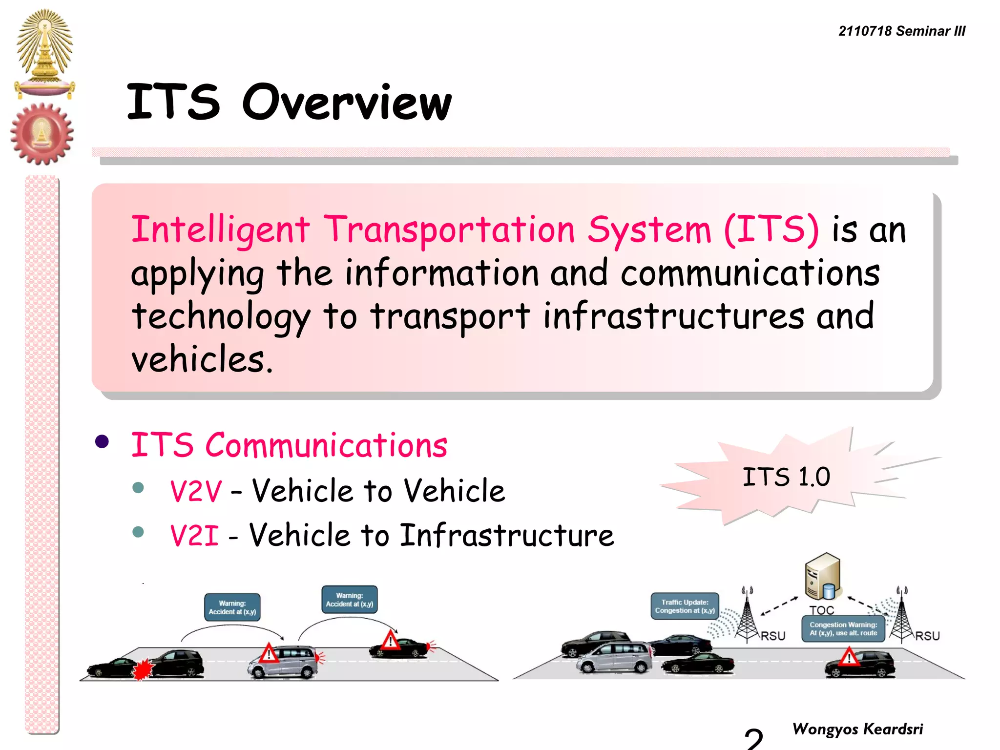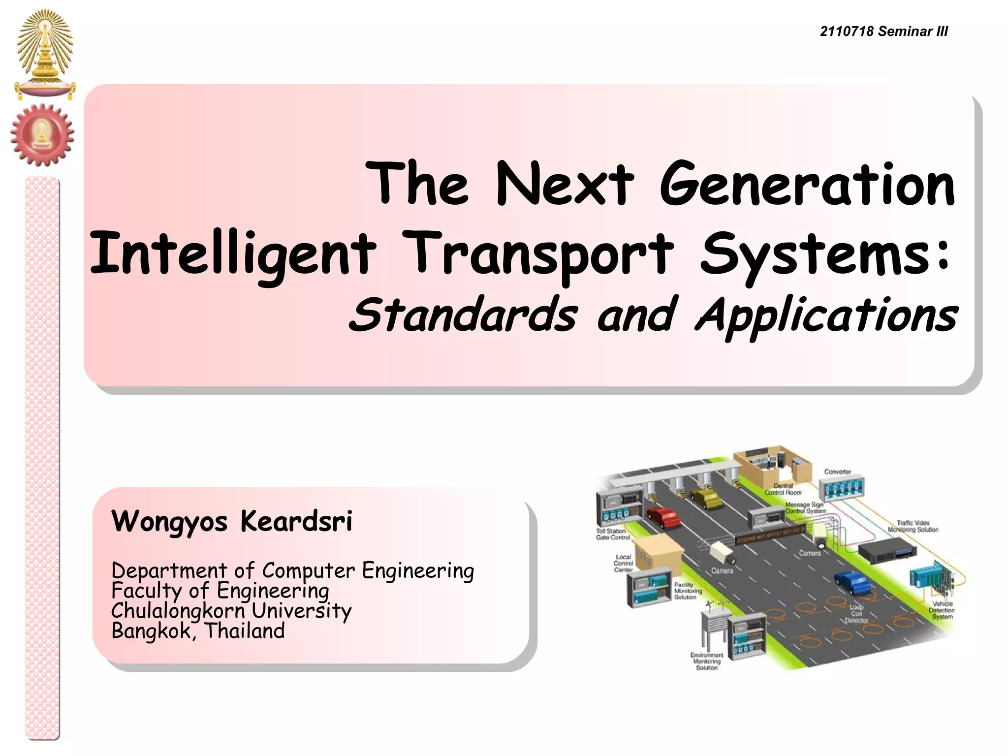 This document summarizes Wongyos Keardsri's seminar on intelligent transportation systems and ubiquitous ITS (u-ITS). It defines ITS as applying information and communication technologies to transport infrastructure and vehicles. Next generation ITS applies ubiquitous computing. U-ITS aims to provide transportation services that are user-centric, always available, seamless, and provide transparency of transportation environment status. The document also compares ITS and u-ITS and describes examples of u-ITS projects in the USA, Europe, Japan, and Thailand.