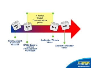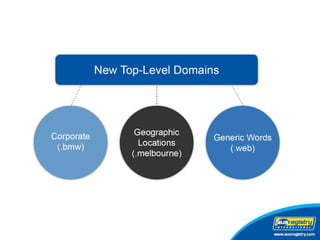 The document discusses the upcoming introduction of new generic top-level domains (gTLDs) by ICANN as the next revolution for the internet. It notes that after 25 years, domain names are evolving beyond .com by creating new opportunities for digital real estate in top-level extensions like .brand, .when, or anything else. This will allow for more choice, control and relevance for internet users and businesses, though applying for and running a new gTLD will involve application, consultant, and ongoing registry costs.