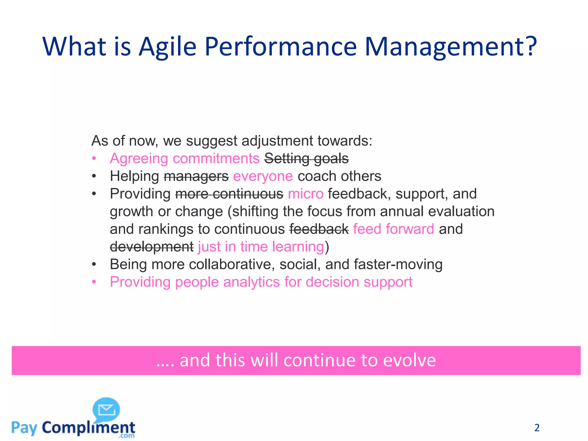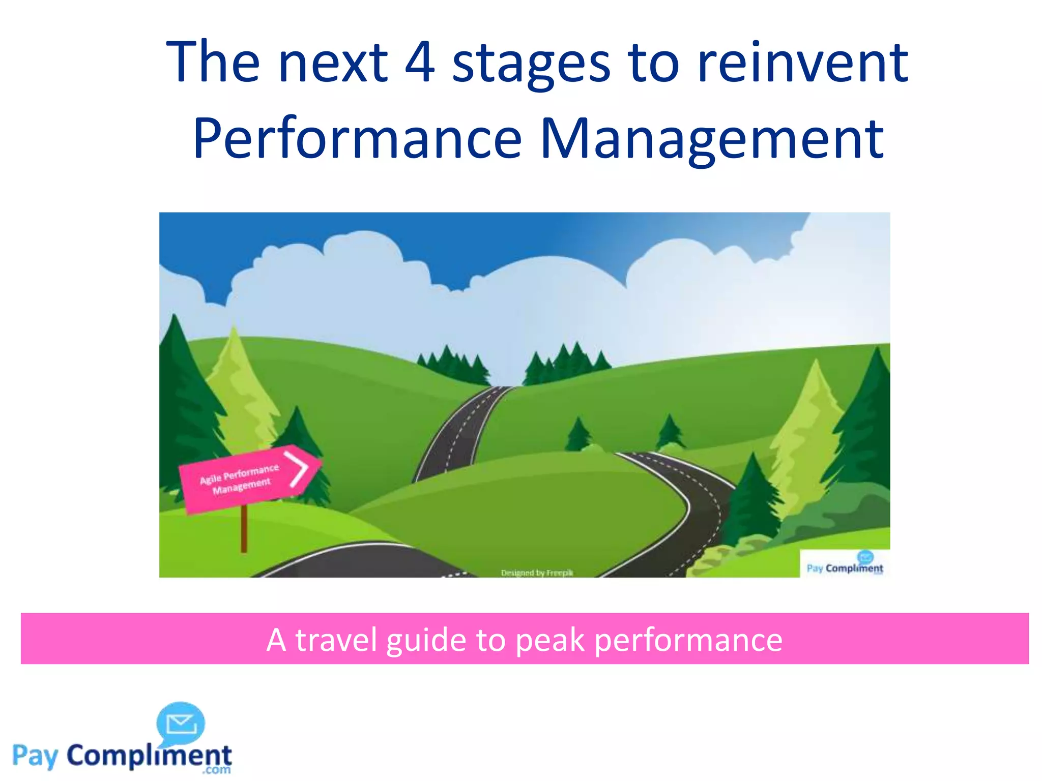 This travel guide outlines a four-stage journey to reinvent performance management with a focus on agile practices, emphasizing continuous feedback, collaboration, and people analytics. It addresses challenges such as unclear communication, unfulfilled expectations, and thwarted intentions while suggesting strategies for overcoming these obstacles. The guide promotes a culture that values clear expectations, risk-taking, and support for employees amidst changes in performance management approaches.