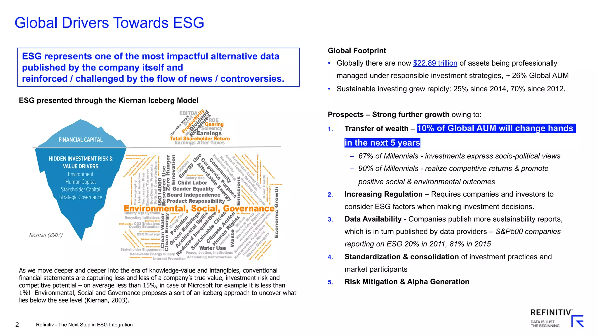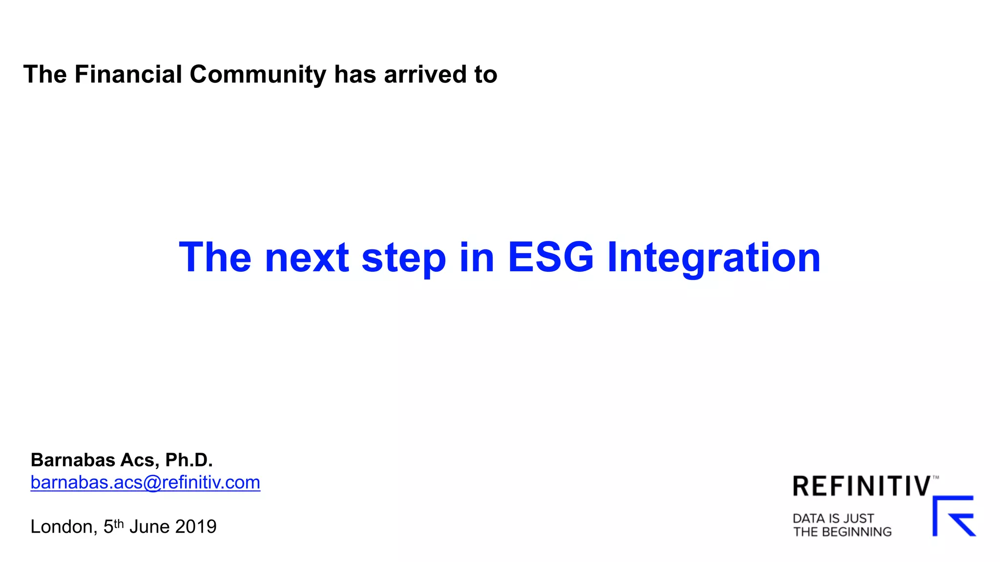 Refinitiv enables tailored integration of ESG into the research, investment vehicle creation, and investment management processes through audible, standardized data across all Environmental, Social and Governance pillars, transparent and customizable rating mechanism, and regularly updating controversies. Refinitiv provides a wide range of concorded historic and forward looking fundamental and pricing data, and value-add index calculation services supporting thematic investments. Refinitiv aims to be the next step in ESG Integration.