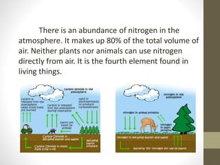 The nitrogen cycle describes how nitrogen moves between the atmosphere, soil, plants, and animals. Nitrogen makes up most of the air but cannot be used by plants and animals in its atmospheric form. Bacteria play a key role in fixing nitrogen by converting it into forms that can be used by plants through processes like nitrification and assimilation. Humans have disrupted the natural nitrogen cycle through activities like fertilizer use that introduce excess nitrogen. Maintaining the balance of the nitrogen cycle is important for ecosystems and the environment.