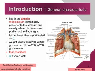 1. It describes the general characteristics of the heart such as its location in the mediastinum behind the sternum, that it lies within a fibrous pericardial sac, and that it has four chambers and a three-layered wall.