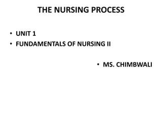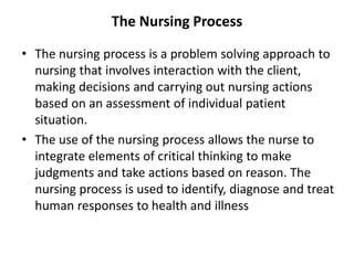 The document outlines the nursing process as a structured approach to patient care, consisting of five components: assessment, nursing diagnosis, planning, implementation, and evaluation. It details how nurses utilize critical thinking to address patient needs and interact with clients, and discusses the advantages and disadvantages of the process for patients, nurses, and the community. The emphasis is on creating individualized care plans and the ongoing evaluation of patient outcomes.