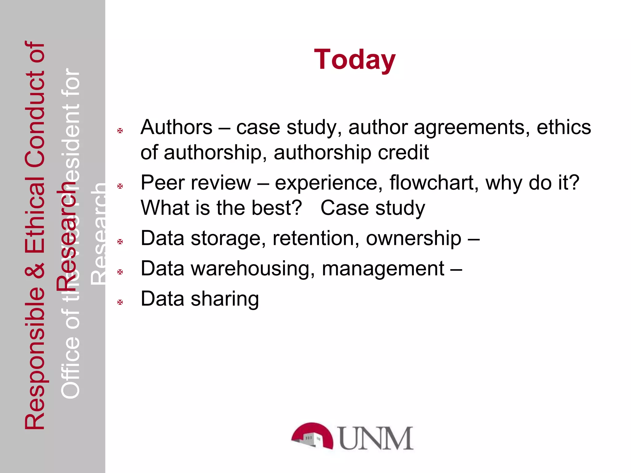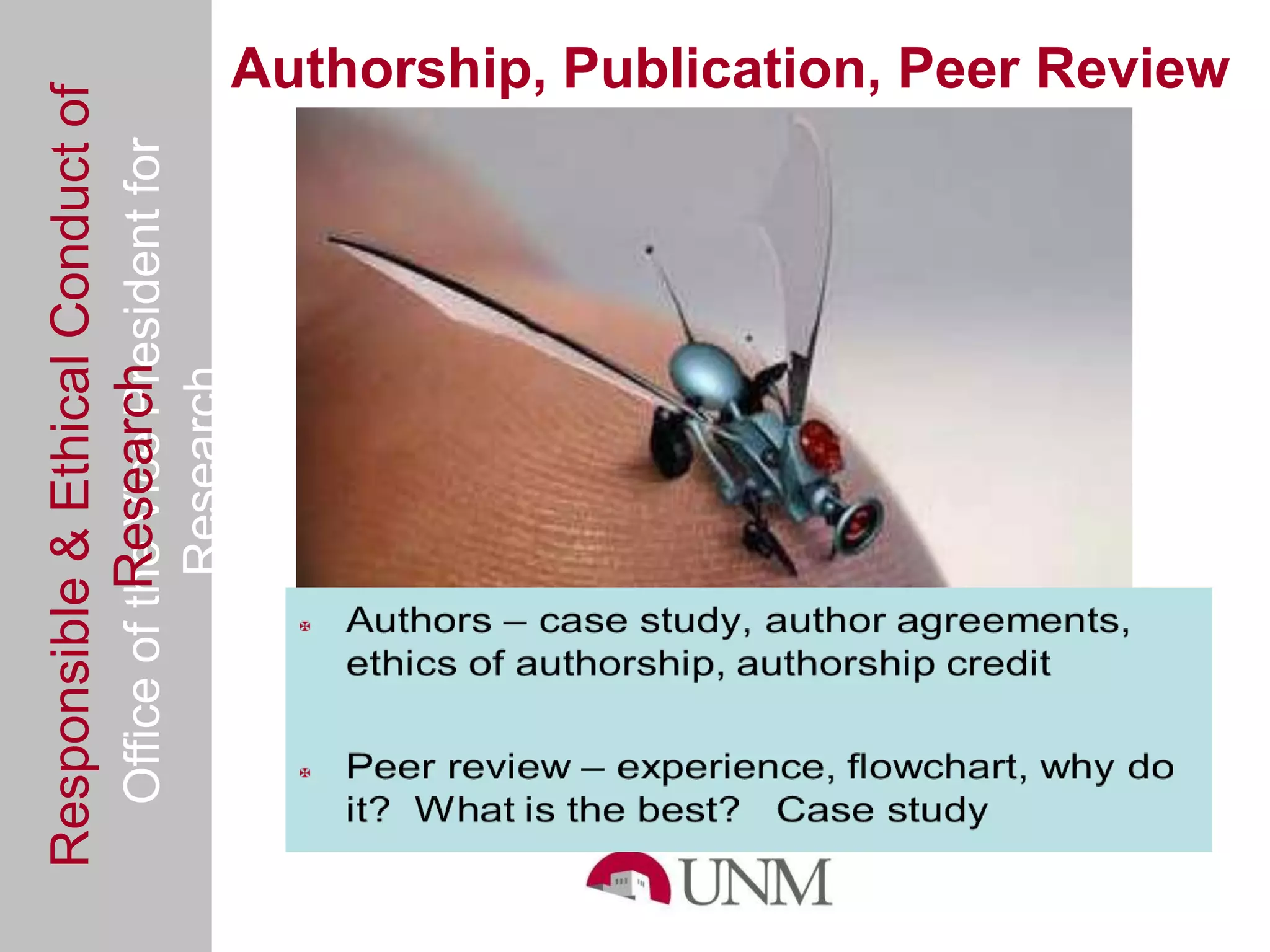 The document discusses responsible and ethical conduct regarding authorship, publication, and peer review. It addresses authorship criteria and responsibilities, potential issues with plagiarism and self-plagiarism, journal instructions for authors, responsibilities and challenges with peer review, and issues around data acquisition, management, ownership and sharing of research. Two case studies are also presented related to these topics.
