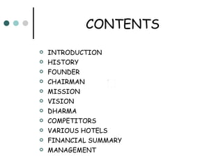 The Oberoi Group is a luxury hotel chain founded in 1934 in India by Rai Bahadur Mohan Singh Oberoi. It currently operates 29 hotels across 5 countries. The Oberoi Group is led by Chairman and CEO P.R.S. Oberoi, the son of the founder. The company aims to provide excellent service and meet guest expectations through its mission, vision, and values of conducting business ethically and putting customers first. Some of its iconic properties include The Oberoi in New Delhi, The Oberoi Amarvilas in Agra, and The Oberoi Udaivilas in Udaipur.
