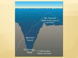 - Ocean floors have various features like trenches, ridges, canyons, and atolls. The floor is divided into shelves, slopes, and plains.