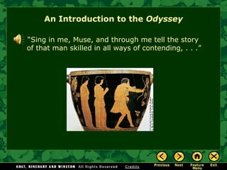 The document provides an overview of the ancient Greek epic poem The Odyssey. It summarizes that the poem tells the story of Odysseus's long journey home after the Trojan War and the troubles he faced, as well as his son Telemachus's search for his missing father. The document also discusses key characters like Odysseus and Telemachus, important events in the story like the Trojan horse trick, and cultural aspects like the relationship between heroes and gods and the oral tradition of epic poetry in ancient Greece.