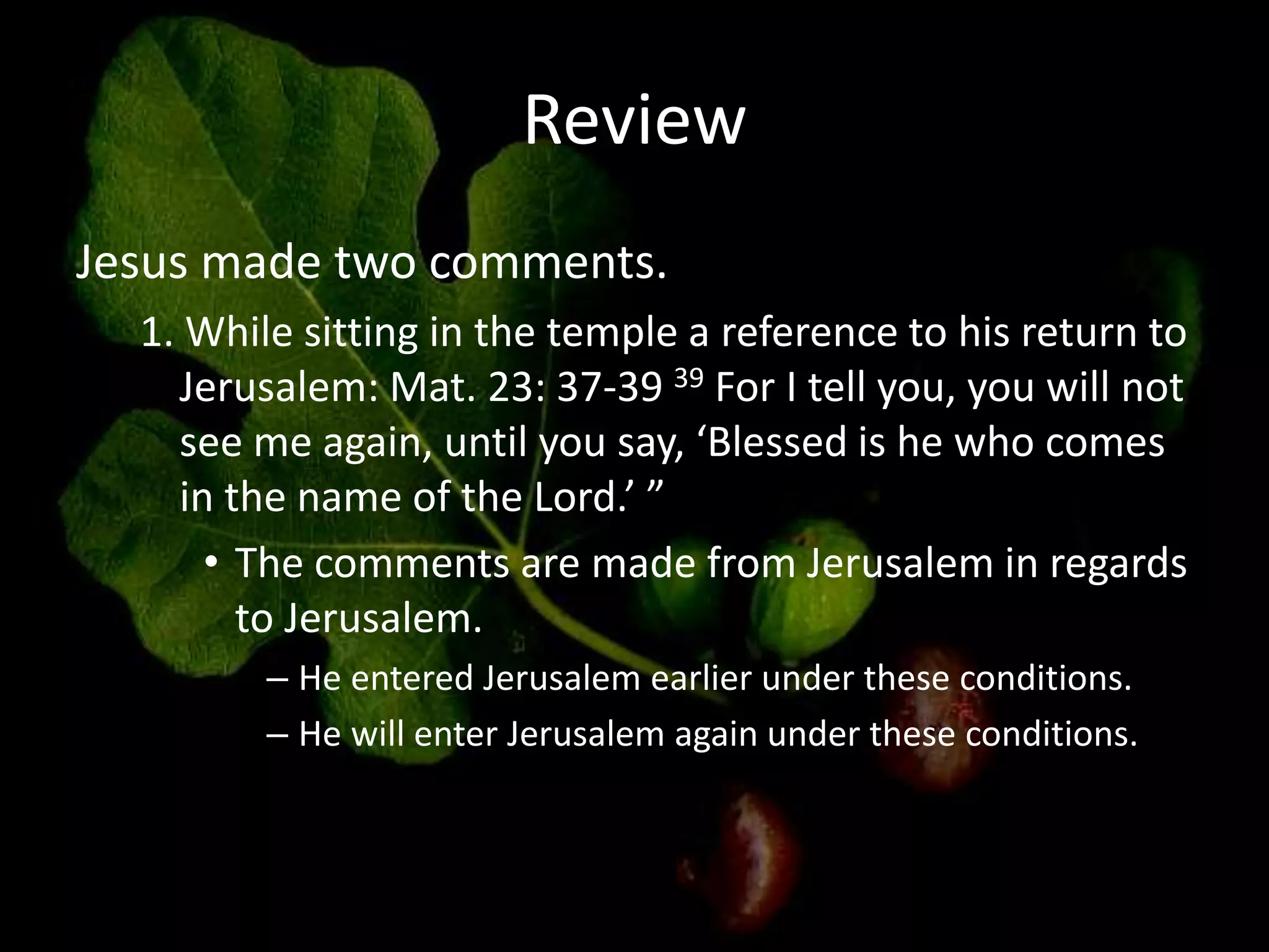 The document discusses Jesus' Olivet Discourse, particularly focusing on the signs of his coming and the close of the age, as recorded in Matthew 24:29-35. It highlights the disciples' questions about the timing of these events and their link to the destruction of the temple, anticipating the establishment of Christ's kingdom. The text emphasizes prophetic allusions from the Old Testament, detailing the signs that would precede Christ's return and the gathering of the elect from all nations.