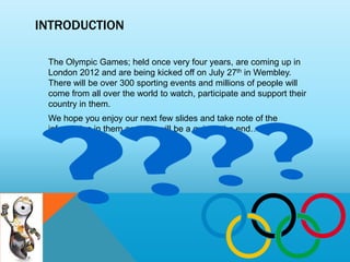 The document provides information about the upcoming 2012 London Olympics, including details about the Olympic village being designed for athletes, a list of summer Olympic sports and events, facts about previous Olympics, and a short quiz. It discusses the dates of the 2012 London Olympics starting on July 27th, millions of people attending, and over 300 sporting events taking place.
