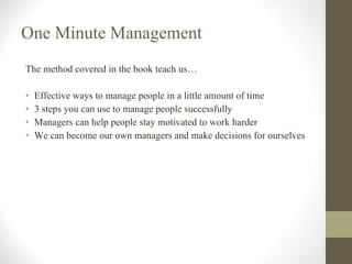 The document outlines the three-step method of 'One Minute Management' by Ken Blanchard and Spencer Johnson, which includes setting one minute goals, providing one minute praisings, and delivering one minute reprimands. Each step aims to enhance employee motivation, accountability, and productivity through clear communication and timely feedback. Overall, effective people management is emphasized as crucial for achieving high performance within an organization.