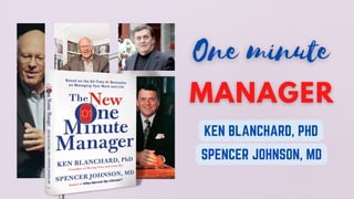The document outlines the principles of 'The One Minute Manager' by Ken Blanchard and Spencer Johnson, emphasizing the importance of effective management practices. It introduces three key secrets: one minute goal setting, one minute praising, and one minute reprimand, all aimed at enhancing employee performance and self-esteem. The authors highlight that effective managers can improve results by fostering an environment where people feel good about themselves.