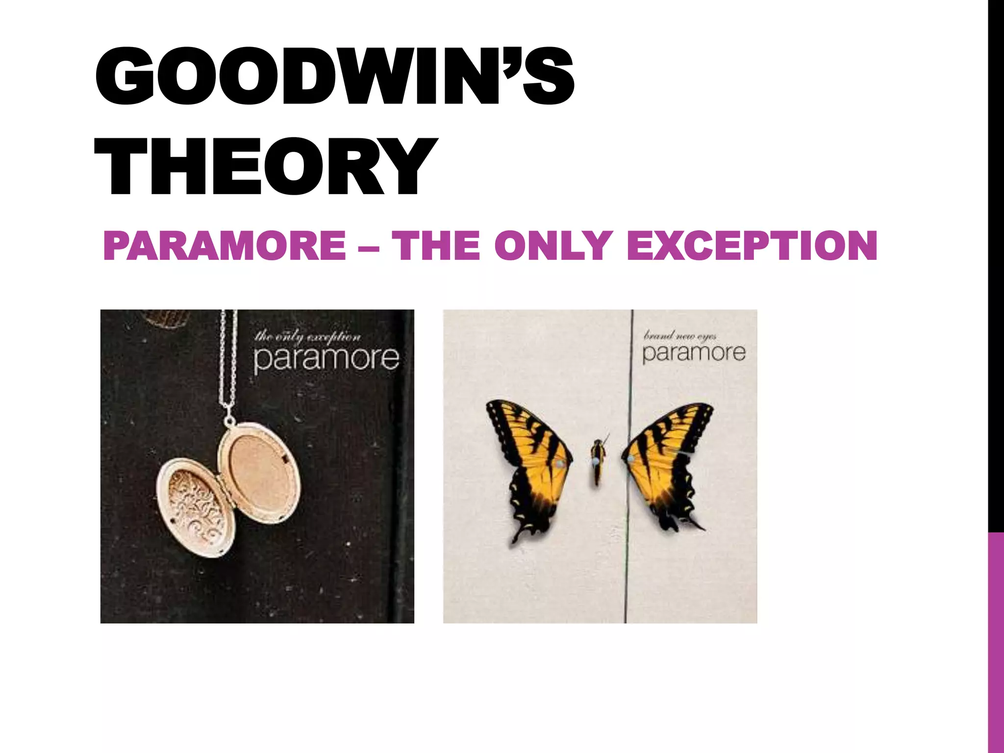 This document summarizes six key features of music videos: 1) relationships between lyrics and visuals, 2) relationships between music and visuals, 3) demonstration of genre characteristics, 4) record label demands, 5) references to notions of looking, and 6) intertextual references. It then analyzes Paramore's music video for "The Only Exception" based on these six features, noting how the visuals amplify the song's message through different scenes representing stages of life. Few direct matches exist between lyrics and visuals, but the video focuses on the singer and promotes her as an alternative mainstream artist, as record labels typically demand.