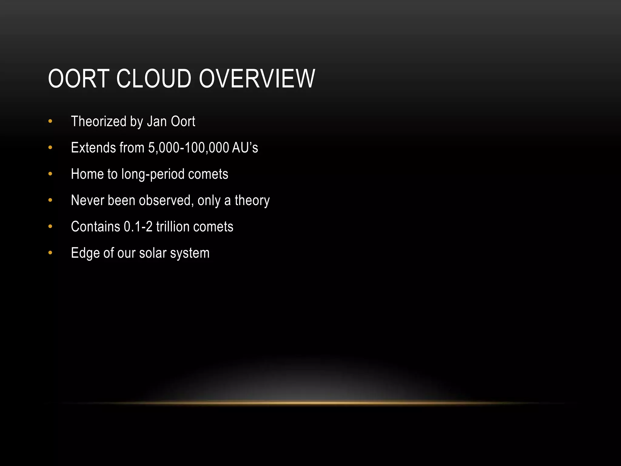 The Oort Cloud is a theorized spherical cloud of predominantly icy planetesimals believed to surround the Sun to as far as halfway to the nearest star. It is thought to be the source of long-period comets. The Kuiper Belt is a disc-shaped region beyond Neptune's orbit populated by numerous icy bodies and extending from 30 to 50 AU from the Sun, including short-period comets and objects like Pluto. New Horizons is an unmanned spacecraft on a mission to conduct the first flyby and study of Pluto and to fly by and study one or more other Kuiper Belt objects after performing a flyby of Jupiter in 2007.