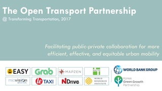 The Open Transport Partnership (OTP) focuses on enhancing urban mobility through public-private collaborations and data management, addressing the needs of rapidly growing urban populations. OTP's initiatives include facilitating PPPs, developing traffic data tools, and creating standardized datasets for transit systems. The partnership aims to leverage private-sector innovations to improve urban transport efficiency, equity, and effectiveness.