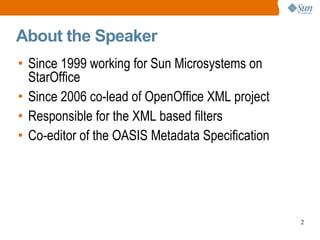 Svante Schubert presented on metadata and the new metadata model for OpenDocument Format 1.2. The new model addresses limitations of the current ODF metadata by making it more extensible and descriptive. It uses RDF and OWL to annotate content in a common way, aligning with semantic web standards. Metadata is stored in RDF files and linked to content elements via IDs. This allows software to more easily find, combine and share information. OpenOffice.org 3 will provide APIs to access and extend the new metadata capabilities.