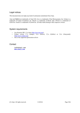 OptimJ is an extension of Java for writing optimization models, supporting bulk data processing and algebraic modeling similar to other languages like AIMMS and GAMS. It operates directly on Java objects and includes integration with various optimization engines such as LP_Solve and Gurobi, as well as offering a familiar programming environment through the Eclipse IDE. The manual provides a comprehensive overview of OptimJ features, installation guidance, and coding constructs for creating optimization models.