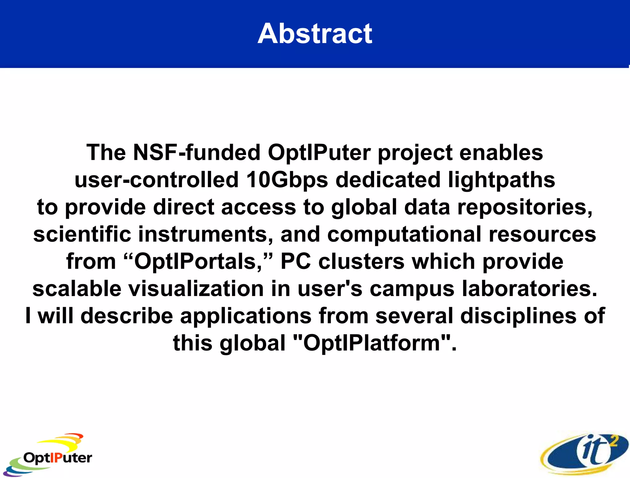 The document discusses the Optiputer project, which provides user-controlled 10 Gbps lightpaths for global data access and scientific collaboration through 'optiportals.' It highlights various applications across disciplines, infrastructure investment, and collaborations among universities and industries to create a robust cyberinfrastructure to support data-intensive research. The project aims to enhance data visualization and collaboration capabilities for advanced scientific initiatives, showcasing technology like high-definition streaming and advanced computing resources.