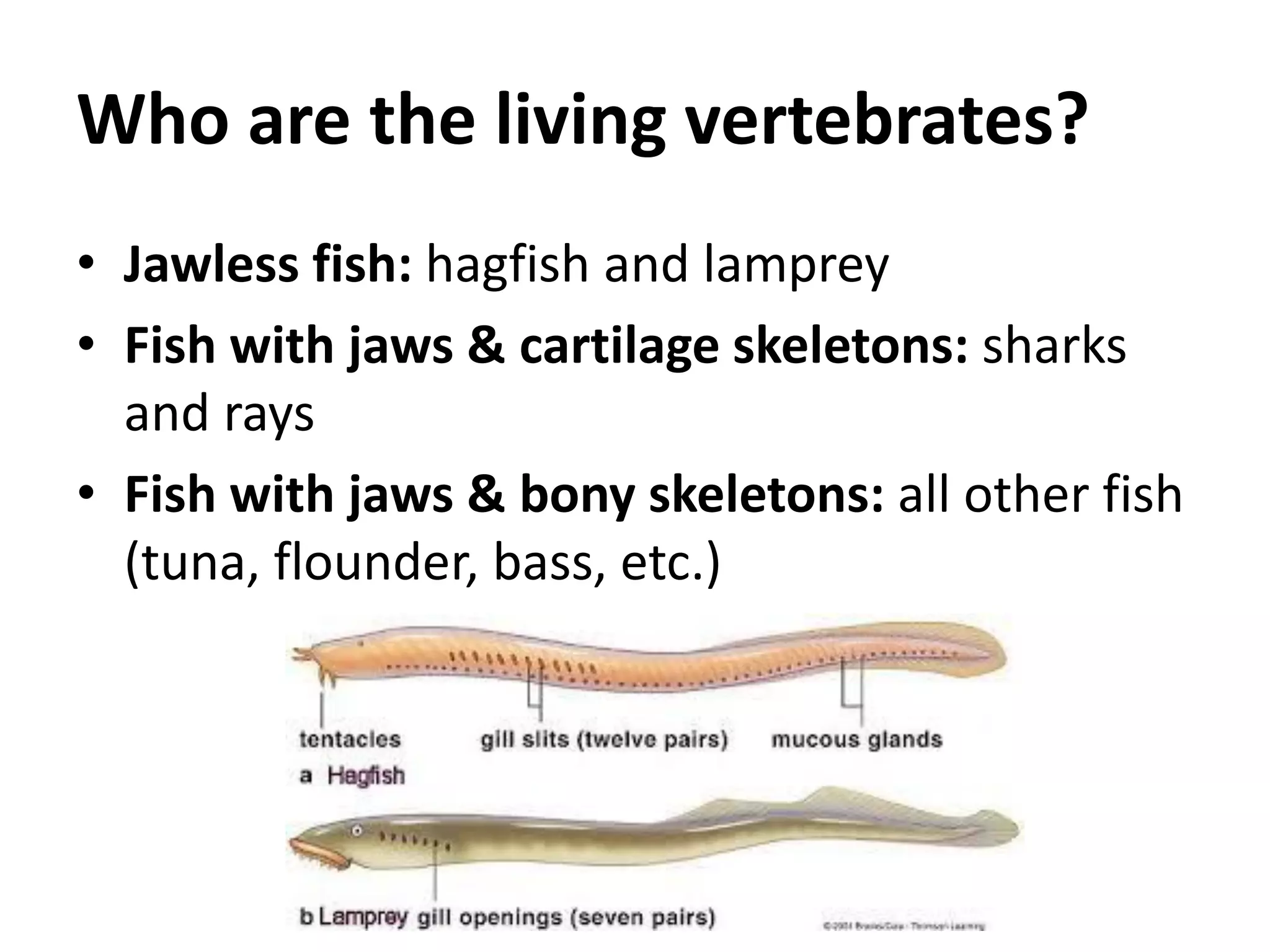 This document summarizes the evolution of vertebrates from their earliest ancestors to modern forms. It describes the key traits that unite each major group, from non-vertebrate chordates like tunicates and lancelets, to the earliest jawless fish like hagfish and lampreys, to jawed fish groups like sharks and bony fish. It outlines the major transitions from marine to freshwater habitats and the evolutionary innovations in skeletal and sensory systems that occurred in the main vertebrate lineages over 500 million years.