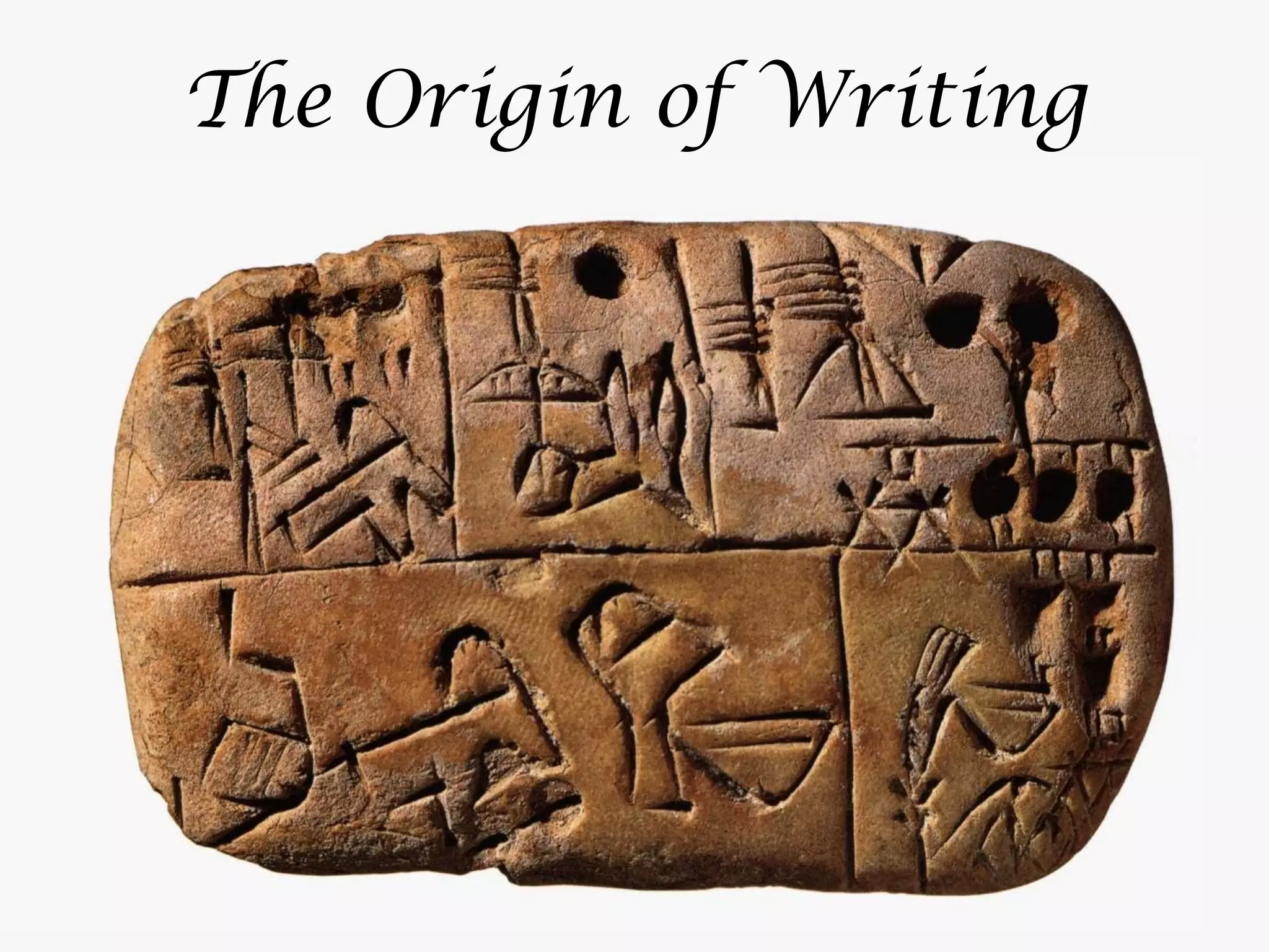 The document discusses the origins and evolution of writing, highlighting its early function primarily as a bookkeeping system for managing goods in temples and palaces before 2700 B.C.E. It details the development of clay tokens, cuneiform writing, and the emergence of pictographs, logograms, and phonograms as methods of representing language. The transition to syllabograms is also noted, marking a significant advancement in written communication.