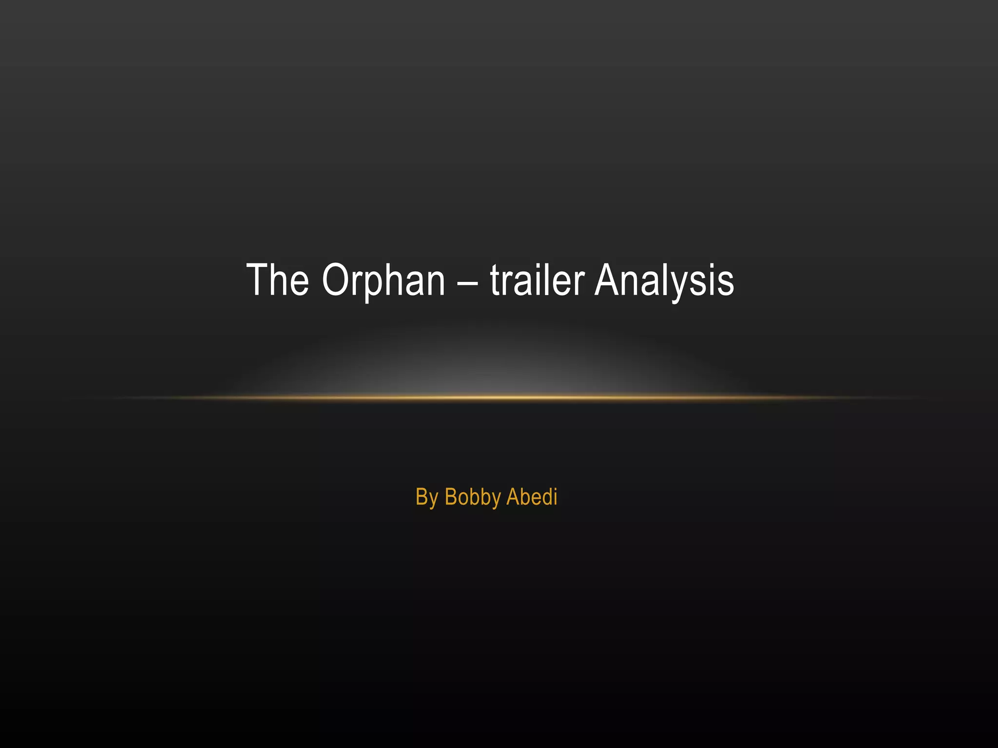 The trailer for the film "The Orphan" follows a conventional structure by starting slowly showing the family adopting a child named Esther, then revealing something is troubling with Esther through violent scenes. Visuals show Esther tormenting the family but don't reveal outcomes. Genre cues like the orphanage background, isolated house setting, and disturbed child antagonist identify it as a psychological horror. Common horror conventions like these attract the target audience by signaling themes they expect like a troubled individual seeking revenge through common victim archetypes in familiar settings.