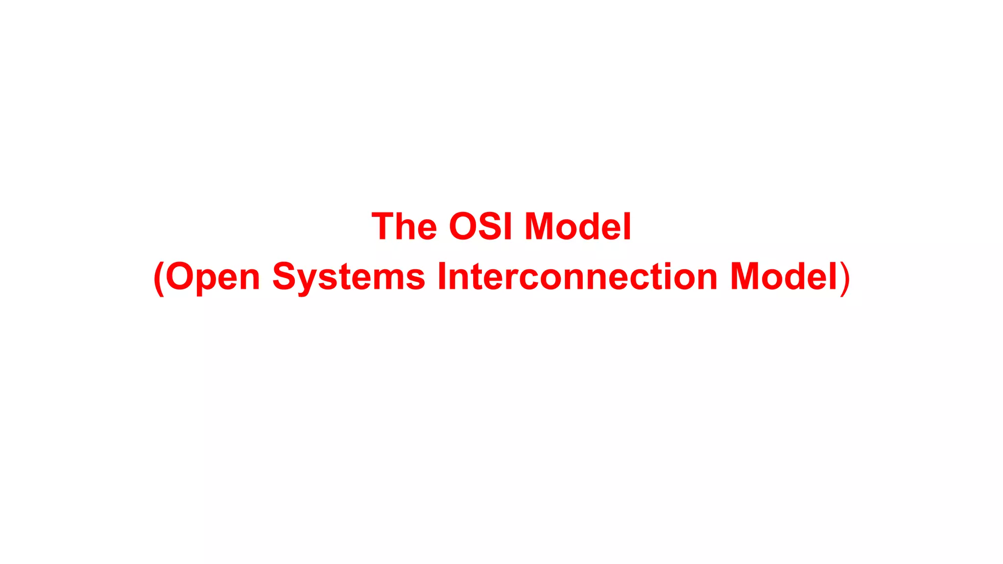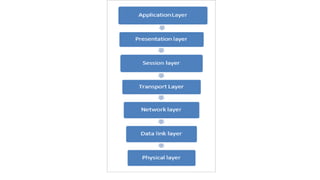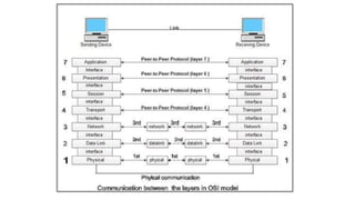 The OSI model is a conceptual framework that characterizes networking functions into 7 layers - physical, data link, network, transport, session, presentation and application. Each layer has a specific role, with the physical layer defining physical connections and signals and the application layer supporting file transfer, email and directories. Data moves down from the application layer through each layer, with each adding information like headers for routing. This allows interoperability between different network products and software.