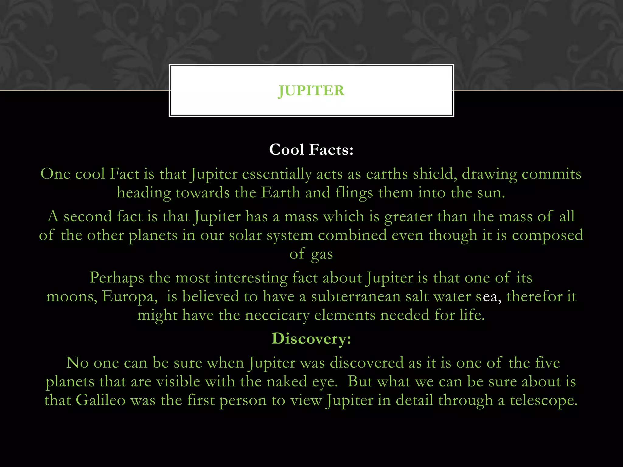 1) Jupiter acts as a shield for Earth, drawing comets towards the sun. One of its moons, Europa, may have an underground ocean suitable to support life.