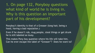 This document summarizes chapters 9 and 10 of the novel "The Outsiders" and provides questions and answers about the chapters. It discusses Ponyboy questioning his identity and world, the individual reasons the boys fight, why Darry is hesitant to let Pony fight, the differences between Tim Shepard's gang and Darry's gang, Johnny's last words and their meaning, how Johnny's death affected Dally and led to his unraveling, and Ponyboy's actions while delirious showing his mended relationship with Darry.