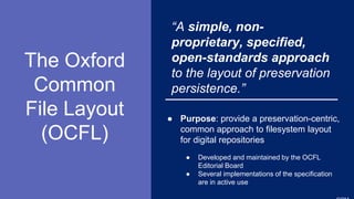 The document discusses the Oxford Common File Layout (OCFL), a specification developed for the preservation-centric organization of digital repositories. It highlights OCFL's benefits, including versioning, readability, and storage diversity, and its implementation in various digital preservation systems, such as Fedora and Harvard's Digital Repository Services. The document also points out challenges and future goals for repository scalability and integration with existing systems.