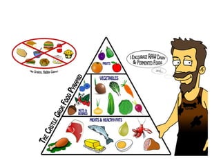 The document provides lists of recommended and non-recommended meats, fruits, vegetables, nuts and seeds as well as cooking oils for a paleo diet. It also includes potential benefits of following the diet such as better health, weight loss and more energy. Finally, it shares several paleo diet recipes and references for further information.