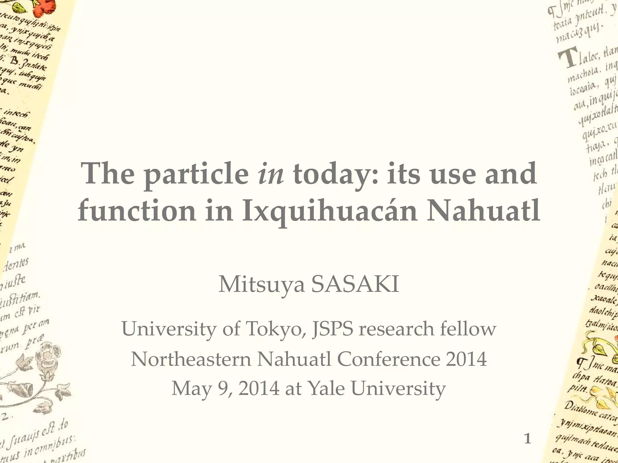 The particle (i)n is used systematically in Ixquihuacán Nahuatl to mark definiteness and givenness, functioning similar to a definite article. While (i)n originated as a subordinator or adjunctor in Classical Nahuatl, it has taken on a more determiner-like role in Ixquihuacán Nahuatl. The use of (i)n is obligatory with name entities and other type-e expressions, even in focus, though it is replaced with yeh when such expressions are in a predicate focus position. Overall, (i)n builds sentences and discourse in Ixquihuacán Nahuatl in a systematic way, retaining aspects of its