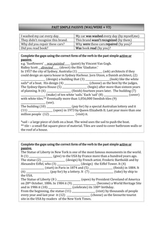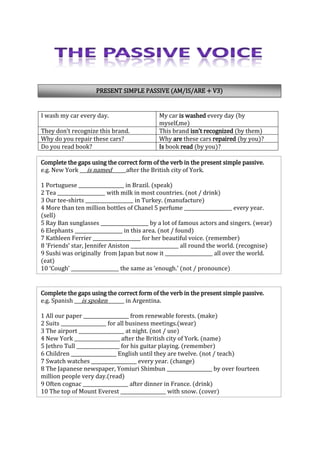 The document summarizes the present simple and past simple passive forms in English. It provides examples of sentences using these forms and then has exercises for learners to complete using the passive voice. For the present simple passive exercises, learners are to fill in the blanks with the correct third person singular verb form. For the past simple passive exercises, learners are to use either the active or passive form of verbs to complete the sentences. The document covers basic grammatical concepts about forming the passive voice in English.