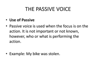 The document discusses the passive voice and how it is used when the focus is on the action rather than the subject performing the action. The passive voice is used when the subject performing the action is unknown or unimportant. An example given is "My bike was stolen" which focuses on the action of stealing rather than who stole the bike.