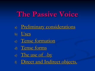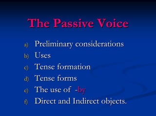 This document discusses the passive voice in English. It covers preliminary considerations about which verbs can be passive, how the passive is used more in English than Spanish. It then discusses the different uses of the passive voice, including when the action is more important than the agent, the agent is obvious/unknown/not important, or to avoid mentioning who did the action. Finally, it discusses tense formation in the passive voice and the use of the preposition "by" as well as direct and indirect objects.