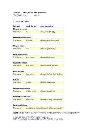 The document discusses the passive voice in English. It describes how the passive voice is formed using the appropriate form of the verb "to be" plus the past participle of the main verb. It provides examples of passive constructions in different tenses. It also explains the functions of the passive voice, such as when the subject experiences the action rather than performs it or when the agent is unknown.