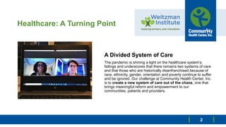 A health care organization laid out plans to reform its delivery system in response to the COVID-19 pandemic. It formed four teams to 1) assess the current crisis delivery model, 2) understand changes in the communities served, 3) develop a new delivery model, and 4) share lessons learned. The organization highlighted gaps in care for underserved groups and a need for more equitable access. It discussed strategies like telehealth, addressing social determinants of health, workforce flexibility, and collaborating with other organizations to build a sustainable system focused on community empowerment and improved outcomes.