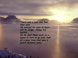 There was a man who sent his four sons to look at a pear tree in different seasons. The first son saw it in winter and said it was ugly. The second saw it in spring and said it was full of promise. The third saw it in summer and said it was beautiful. The last saw it in fall and said it was full of fruit. The man explained that they were all right because each only saw one season, and you cannot truly judge something by only one season of its life.