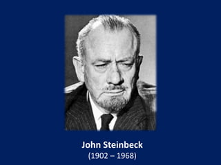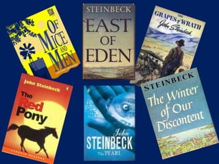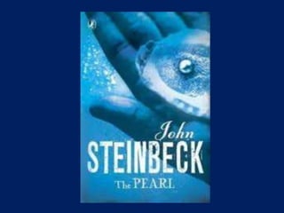This document provides background on John Steinbeck and summarizes the plot of his novel The Pearl. It describes how Kino, a young Mexican-Indian pearl diver, discovers a massive pearl that he hopes will improve his family's lives. However, once word spreads of the pearl's discovery, Kino faces threats and attacks from those who want it. Despite his wife Juana's warnings that the pearl will only bring harm, Kino refuses to give it up as he remains determined to sell it for his son's future.