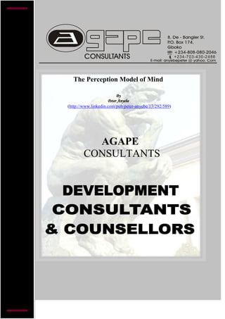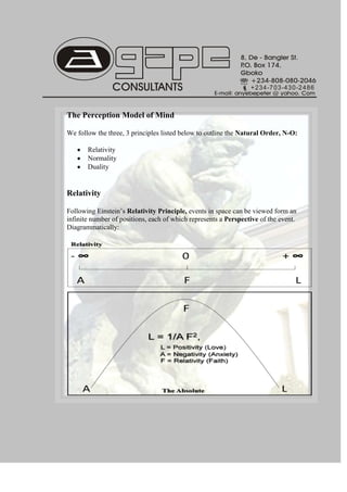 The document introduces the perception model of the mind by Peter Anyebe, outlining three principles: relativity, normality, and duality. It describes the mathematical underpinning of thought processes and perceptions through various equations, detailing the relationships between positivity, negativity, and objectivity. The model also addresses the role of analysis and synthesis in understanding phenomena and posits that optimal minds rank and reconstruct information based on established standards.