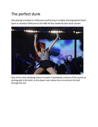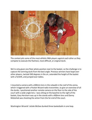 The NBA All-Star Weekend Slam Dunk Contest features athletes competing to perform the most impressive dunks, creating a blend of sport and entertainment. Photographers face challenges to capture these dunks from optimal angles, using remote cameras and various lenses. Blake Griffin's dramatic final dunk, where he leaps over a car, clinches the victory and excites the crowd.