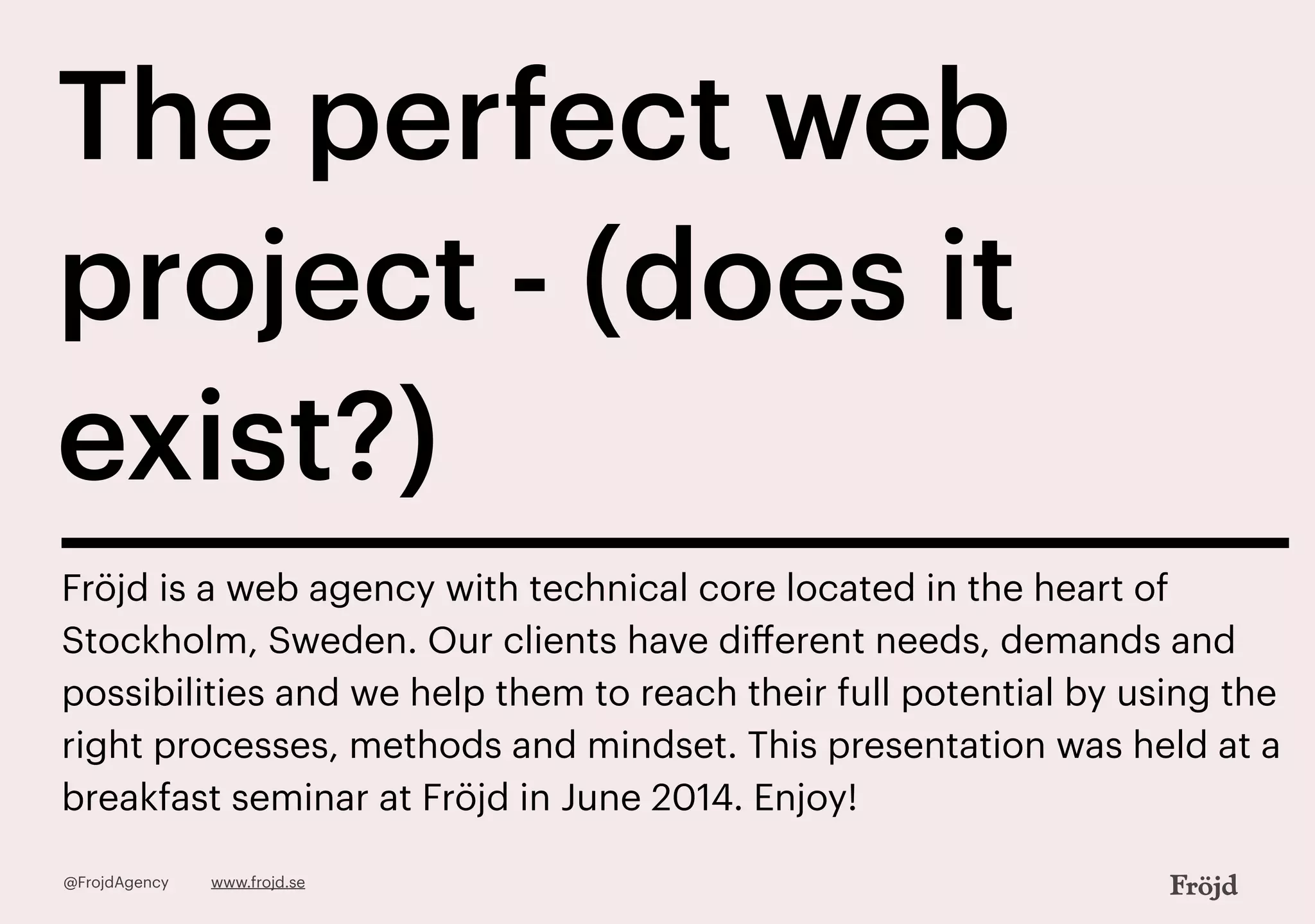 The document discusses the challenges and processes involved in perfecting web projects at the web agency Fröjd in Stockholm. It emphasizes the importance of user experience, constant improvement, and the need for a new approach to digital projects that combines various aspects of marketing, branding, and technology. The presentation offers insights into managing expectations, accountability, and the balance between speed, cost, and quality in project delivery.